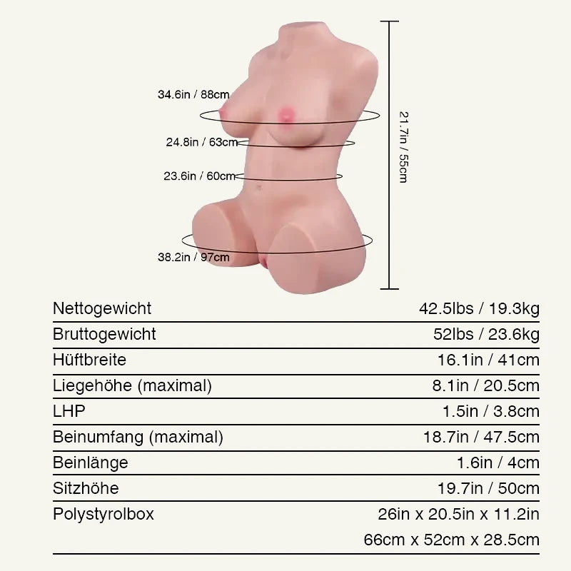 The high-end TPE used by Tantaly offers a soft, supple, and sensual feel. All this in a bust-shaped format perfect for dressing, positioning, and post-coital cuddling.